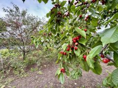 плодоносящий сад с яблонями, сливой, черешней, малиной и крыжовником, а также отмостка с дренажной системой и встроенным летним водопроводом.