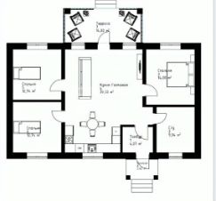 В планировку входит: 2 детские спальни 12,76 кв.м.; Родительская спальня - 14 кв.м.; Кухня - гостиная - 39,33 кв.м.; Тамбур - 4,07 кв.м.; Санузел - 9,04 кв.м.; Крыльцо - 3,45 кв.м.; Терраса - 14 кв.м..