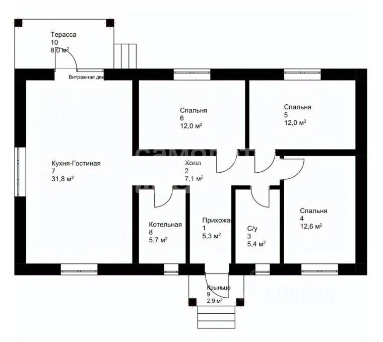 Дом общая площадь 92,2 м2, площадь с учетом летних помещений 103,10. Планировка включает: Холл, кухня-гостиная, 3 спальни, 1 санузел, гардероб, котельная.