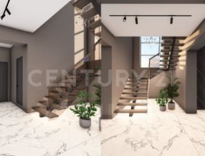 Выполнена предчистовая отделка всего дома, а также начата чистовая отделка гостиной и кухни-столовой - уложен крупноформатный керамогранит 160*80 см.