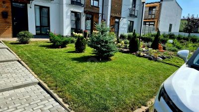 На внешней территории, на участке, посажен газон, туи, голубые ели, кусты можжевельника и барбариса.